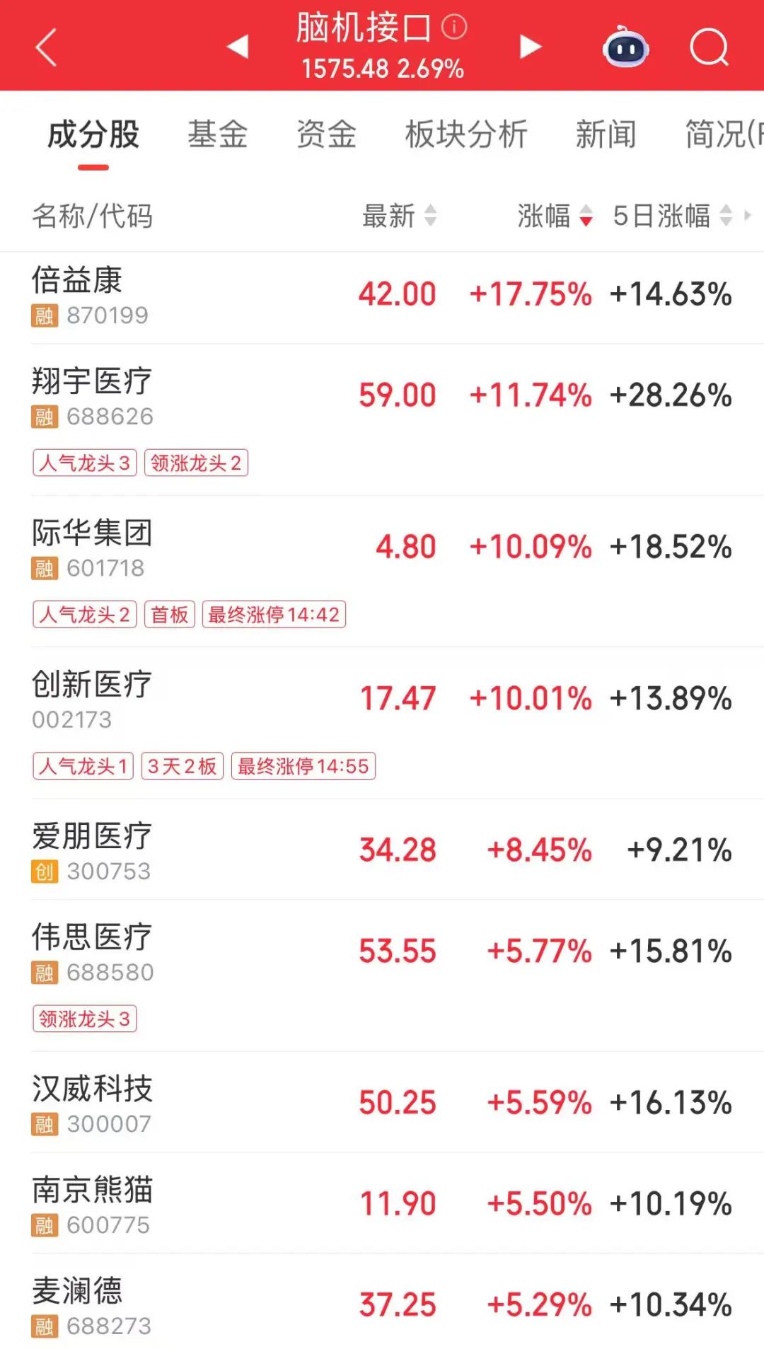 据证券时报·数据宝统计,截至今日收盘,脑机接口概念股涨幅靠前的还有倍益康、翔宇医疗、际华集团、汉威科技等。