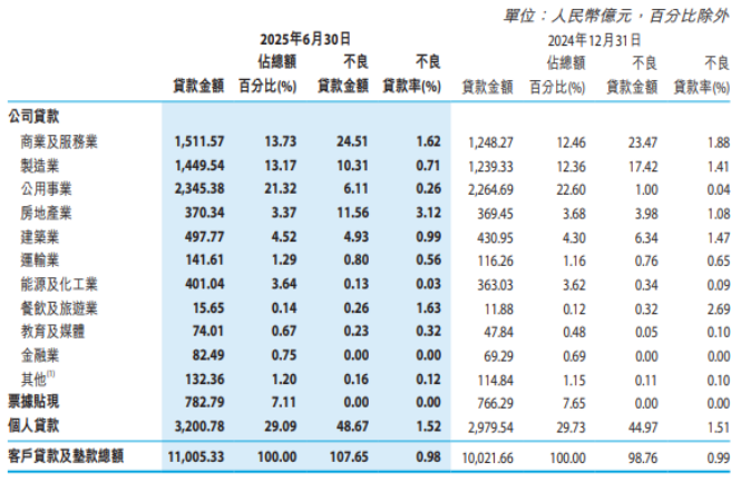 房地产业一直是银行信贷业务的重点领域之一,但也是风险较为集中的领域。徽商银行房地产业不良贷款金额从2024年底的3.98亿元大幅上涨至2025年上半年的11.56亿元,涨幅高达190%,对应不良贷款率从2024年底的1.08%上涨至2025年上半年的3.12%,涨了2.04个百分点。