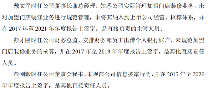 责任链条亦清晰可溯。《事先告知书》显示,时任公司董事长兼总经理戴文军未对加盟门店装修业务进行规范管理,未将其纳入到上市公司经营、核算体系,并在2017年至2021年年度报告上签字,是直接负责的主管人员。时任公司财务总监彭才刚,安排财务部员工出借个人银行账户,未规范加盟门店装修业务的核算,并在2017年至2019年年度报告上签字,是其他直接责任人员;时任公司董事会秘书彭刚毅,未规范公司信息披露行为,并在2017年至2020年年度报告上签字,是其他直接责任人员。