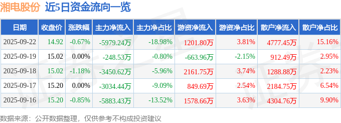 9月22日的资金流向数据方面,主力资金净流出5979.24万元,占总成交额18.98%,游资资金净流入1201.8万元,占总成交额3.81%,散户资金净流入4777.45万元,占总成交额15.16%。