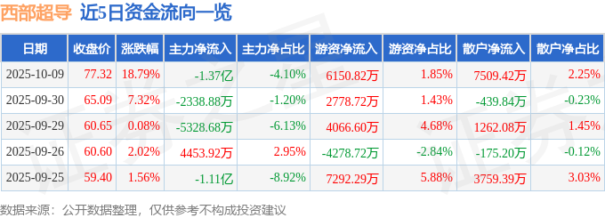10月9日的资金流向数据方面,主力资金净流出1.37亿元,占总成交额4.1%,游资资金净流入6150.82万元,占总成交额1.85%,散户资金净流入7509.42万元,占总成交额2.25%。
