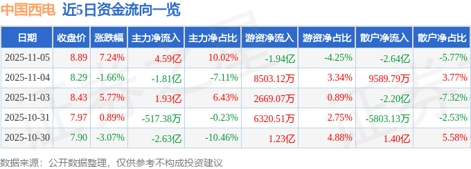 11月5日的资金流向数据方面,主力资金净流入4.59亿元,占总成交额10.02%,游资资金净流出1.94亿元,占总成交额4.25%,散户资金净流出2.64亿元,占总成交额5.77%。